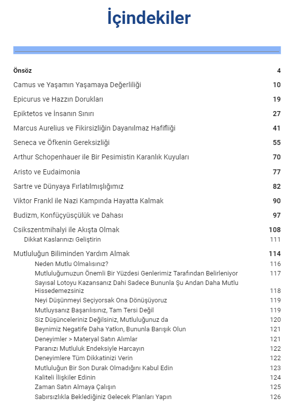 Bu kitapta sizlere büyük düşünürlerin hayat üzerine söylediklerini özetlemeye çalıştık. Hayatın anlamı nedir? Neden buradayız? Hayatın anlamı var mıdır? Nasıl anlam katabiliriz? Neden sürekli mutsuzuz? Sadece biz mi mutsuzuz? Bunlar büyük sorular tabili ki. Kitap içerisinde bu sorular üzerinden bir yolculuğa çıkacağız.